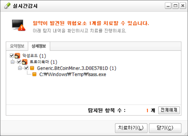 얼마전부터 이상하게 위와 같은 lsass.exe 에 트로이목마가 감지되었다고 알림이 뜬다